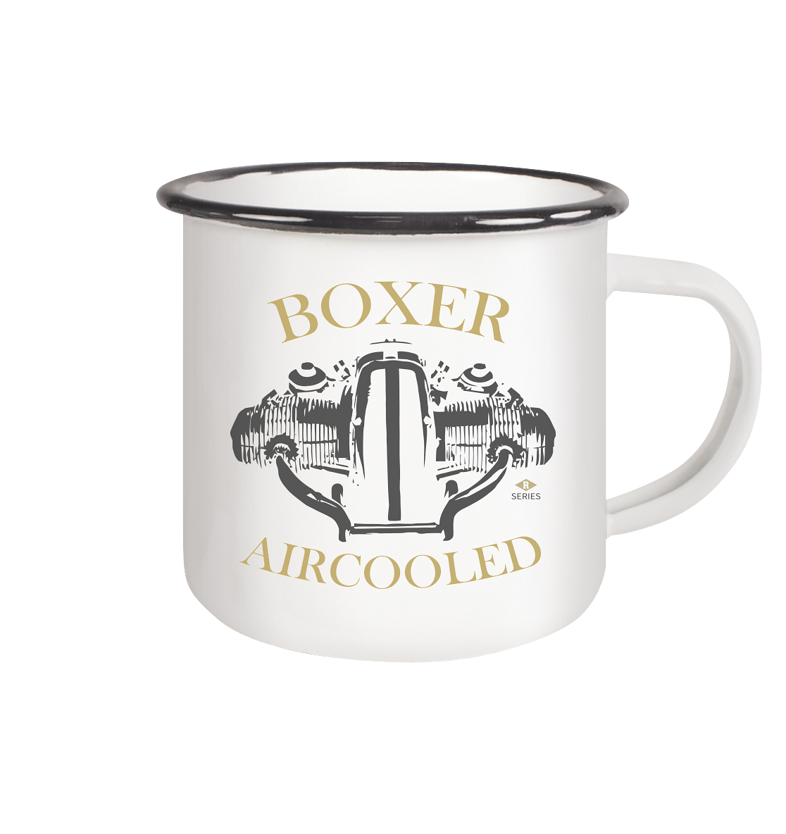 Motiv Boxermotor - Nostalgische Emailletasse weiß mit schwarzem Rand.