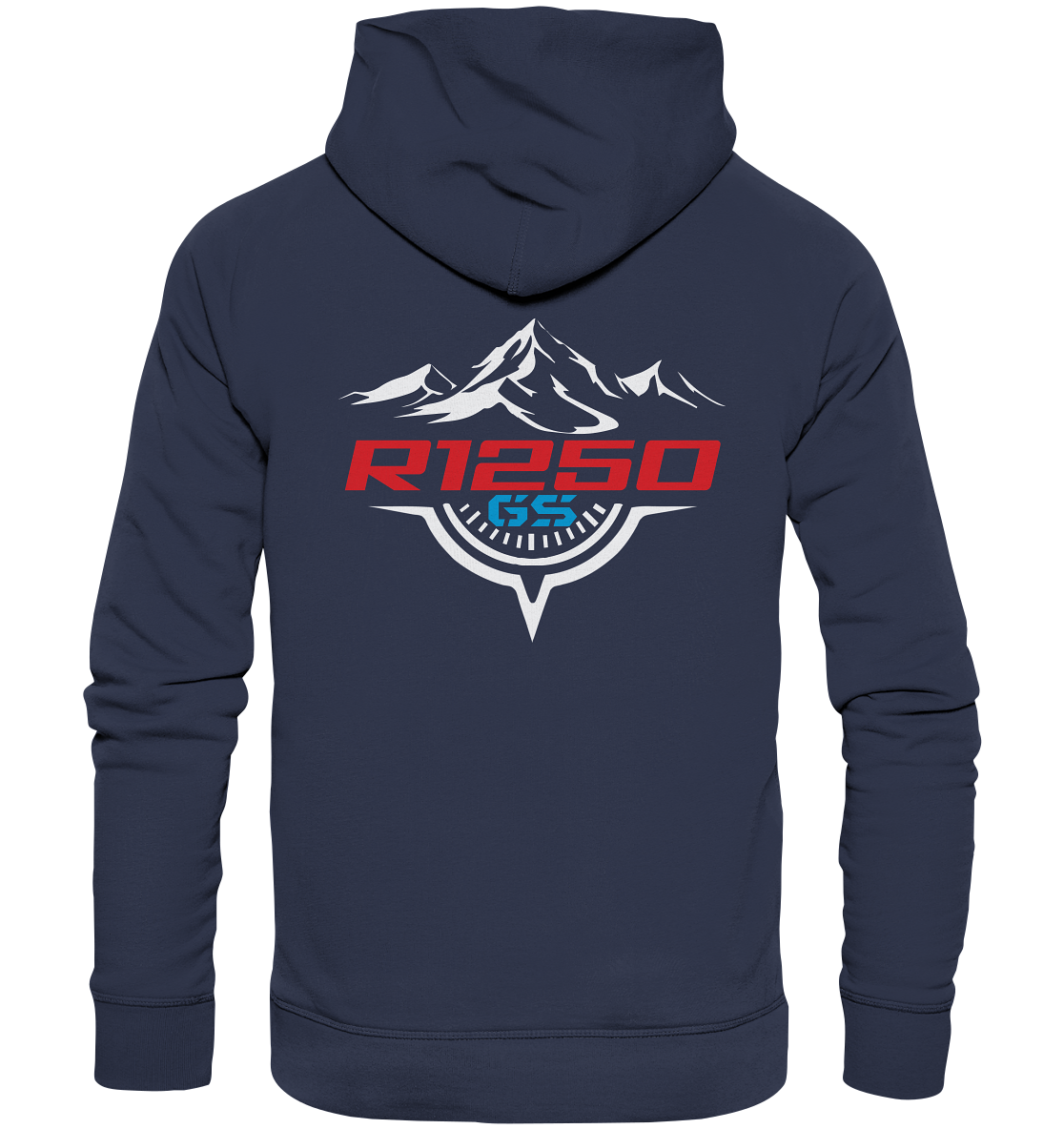 Motiv R1250GS (Rückseite) Berge und Kompass - Premium Unisex Hoodie.